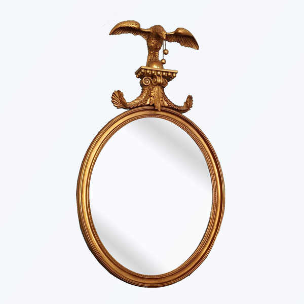 Description: Regency Style Gilded Oval Mirror with Eagle Pediment