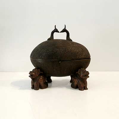 Description: Coconut De Mare Box, Adorned with Carved Tribal Animal Figures