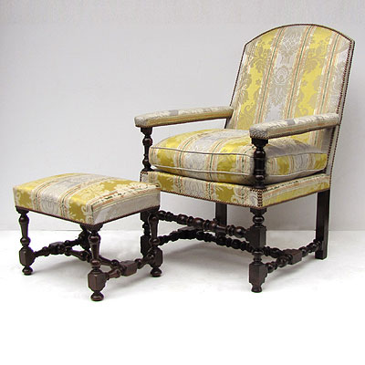 Description: Continental Baroque Walnut Upholstered Open Armchair and Stool