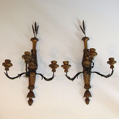 Description: Pair of Carved Gilded Sconces with 3 Candelabra Wrought Iron Arms, unelectrified