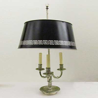 Description: Silver Three Light Bouillotte Lamp Faturing a Hand Painted Tole Shade with Greek Key Motif